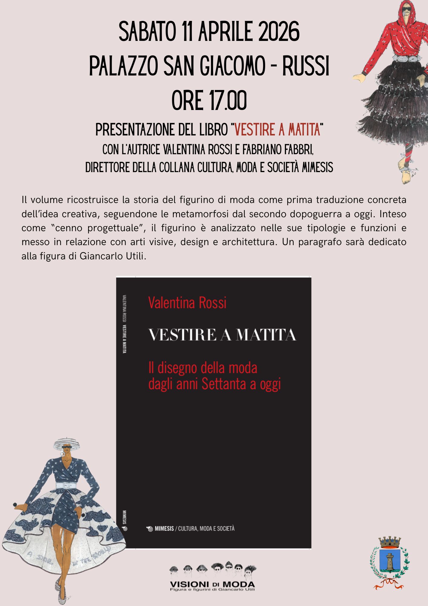 Il primo evento collegato alla mostra Visioni di Moda. Figura e figurini di Giancarlo Utili è in programma sabato 11 aprile 2026, alle ore 17. Si tratta della presentazione del volume Vestire a matita. Il disegno della moda dagli anni Settanta ad oggi (edizioni Mimesis), a cura di Valentina Rossi.